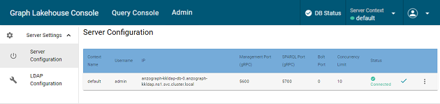7. By default, the Server Configuration context is used both for authenticating front end console users and providing access to an Graph Lakehouse deployment to execute SPARQL queries. Depending on settings in the Graph Lakehouse settings.conf configuration file, the LDAP Configuration option provides the capability to do the following: