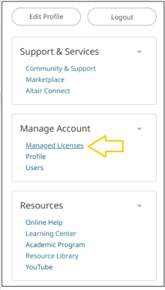 From a web browser on any machine, sign in to Altair One and click on the menu next to your name at the top-right corner. In the Manage Account section, click Managed Licenses.