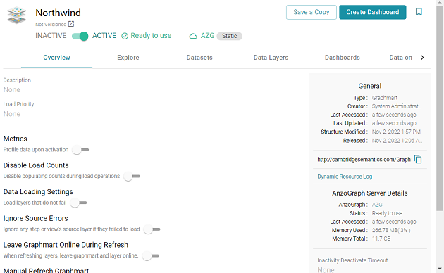 - On the Graphmarts screen, click the name of the graphmart for which you want to create a dashboard. The Overview screen is displayed. For example: