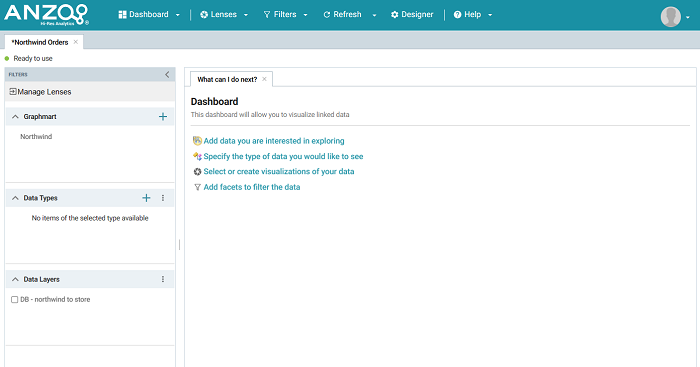 - Click Finish to create the dashboard. The new dashboard appears as a new tab and contains a sub-tab titled What can I do next?. This tab acts as a wizard to guide you through the initial dashboard creation. For example: