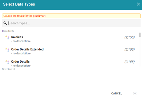 - In the Select Data Types dialog box, select the data type or class of data that you want to display on the dashboard. Graph Studio uses the type, along with any filters, to populate the visualizations (lenses) that you add to the dashboard.