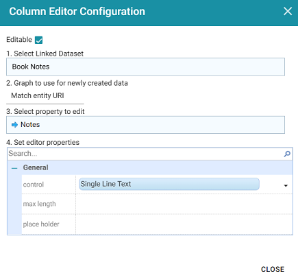 7. Click OK to save the LDS configuration and create the LDS. The LDS is added to the Datasets catalog and it is shown on the Column Editor Configuration screen. Additional editor properties are made available on the screen. For example: