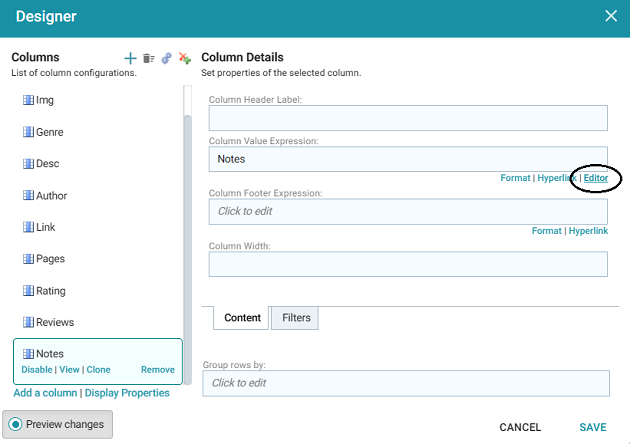 3. In the lens Designer, select a column that will allow input and click the Editor link under Column Value Expression (shown in the image below).