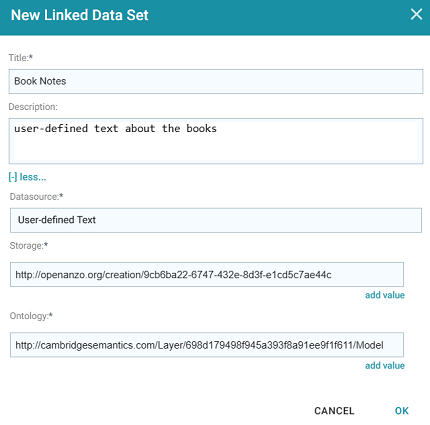 property_URIURIThe URI to use for the new property. You can look at the URIs for other properties in the model and follow the same scheme. For example, <http://cambridgesemantics.com/Layer/698.../Model#GoodReads100kBooks.Notes>.