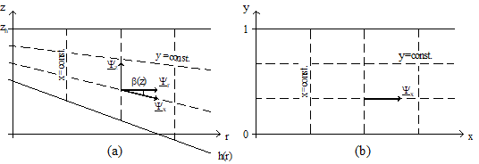 Another possibility to prevent numerical instabilities is the transformation of the irregular computation domain to a rectangular area as shown in Figure 4 for down-sloping ground.