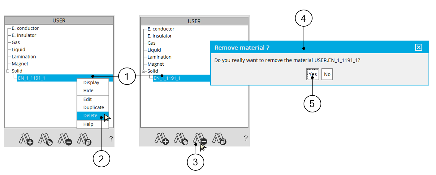 | 5 | The deletion of the material is achieved when clicking on "Yes".