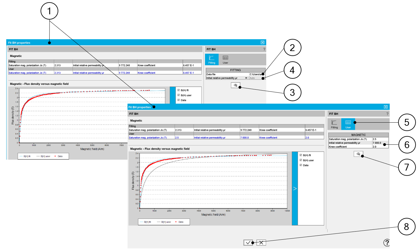 | 1 | Dialog box allowing the characterization of the B(H) curve imported from an Excel file |