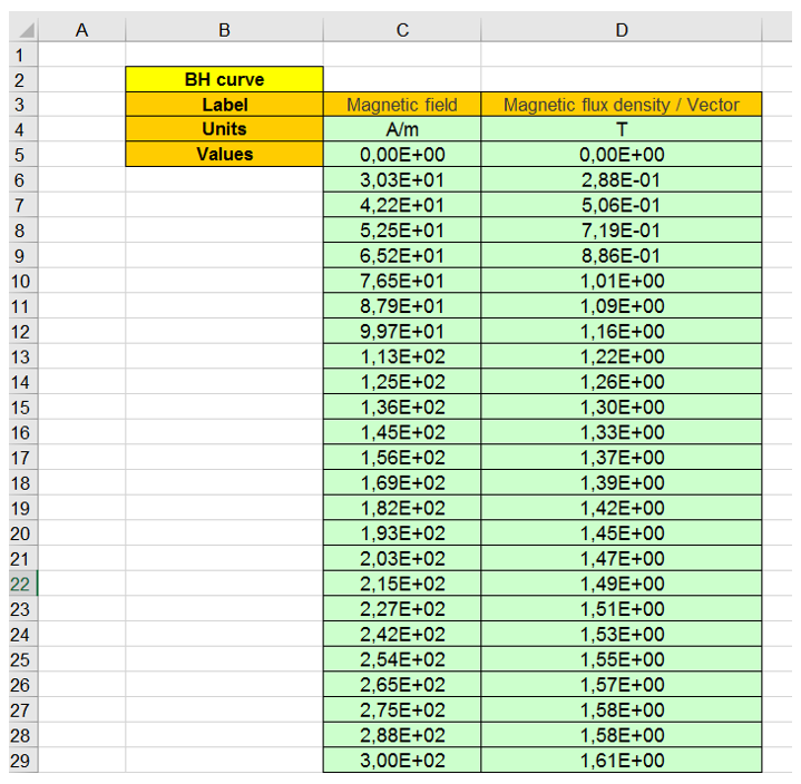 Example of an Excel file to define the B-H curves parameters.