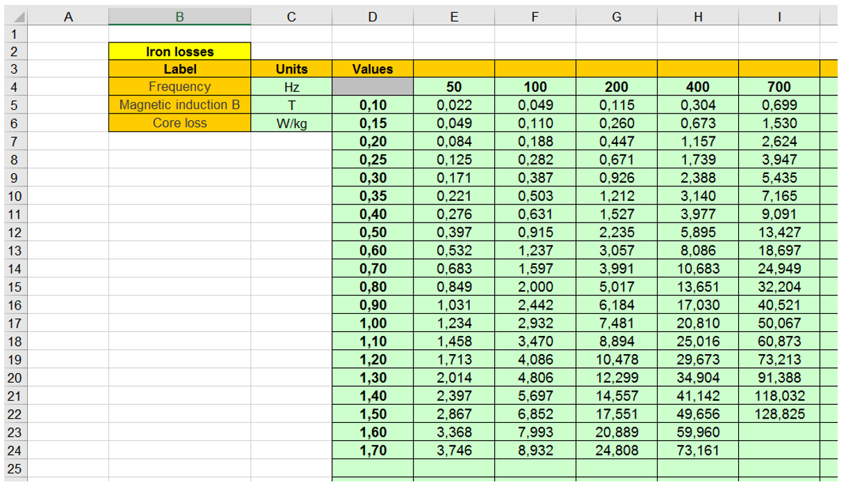 Example of an Excel file to define the curves of iron losses in function of flux density for different values of frequency.