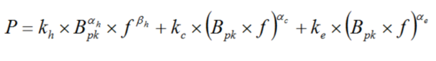 P represents the amount of iron losses per cubic meter. This quantity is computed by considering B in Tesla and f in Hertz. The coefficients are always defined by considering these reference units.