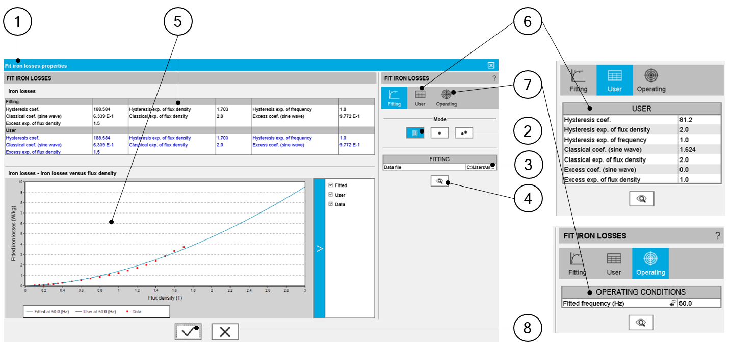 | 1 | Dialog box dedicated to fit the iron loss parameters. Located in the “iron losses” category when visualizing or editing the material properties. |