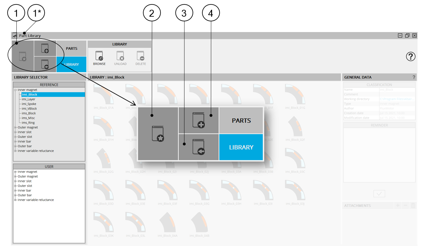| Zone 4 | Visualization of all the parts (thumbnails) stored in the selected library. |