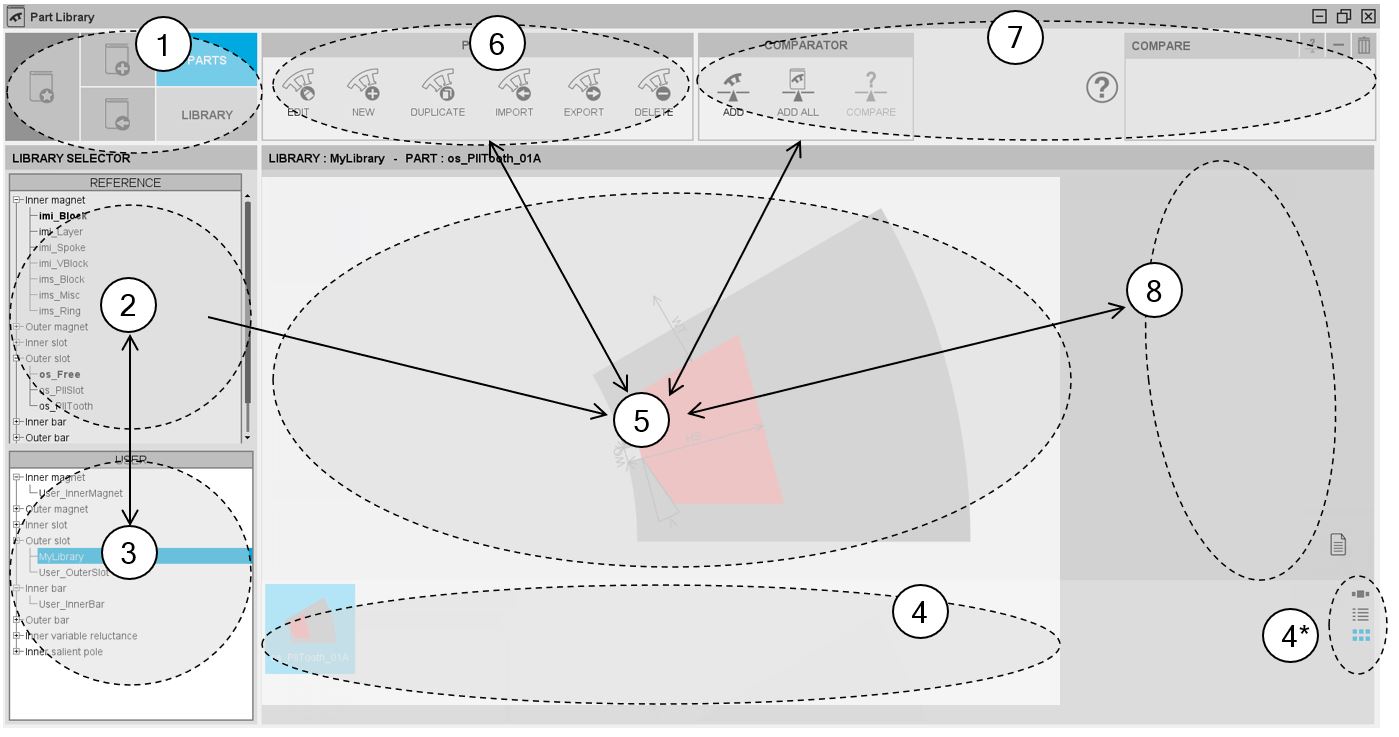 | Zone 6 | Tools to manage the parts: Edit, New, Duplicate, Import or Delete part. |