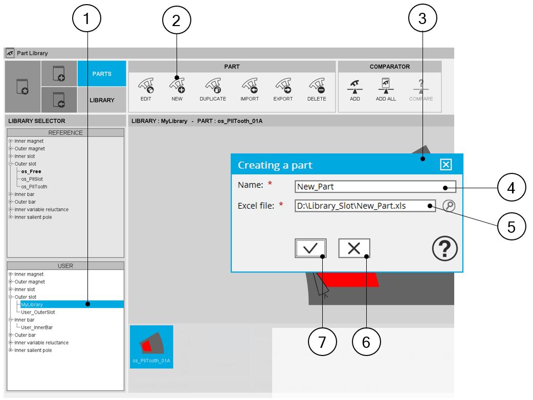 The creation of a new part is possible only in a user’s library. If you select a Reference library, the icon "New" is disabled.