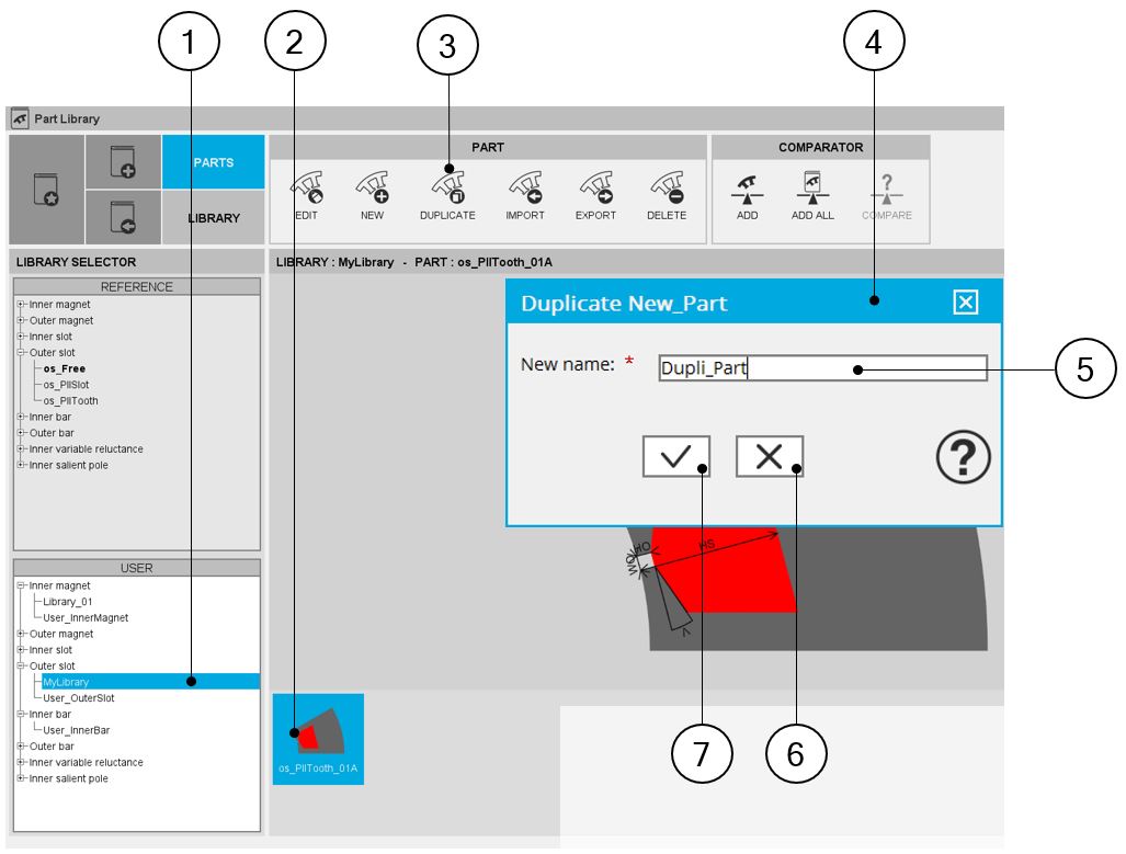 | 1 | Selection of a user’s library in which the part to duplicate is stored. |