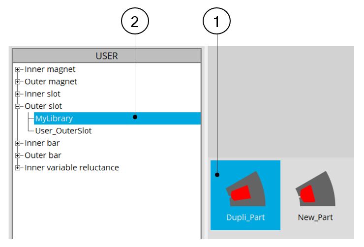 | The new part “Dupli_Part” (1) previously created is stored in the corresponding library (2). |