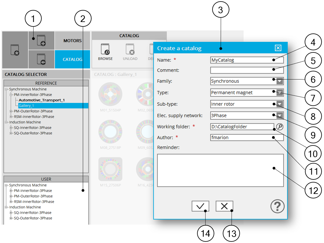 | 14 | Button to close the dialog box and to cancel the creation of the catalog. |