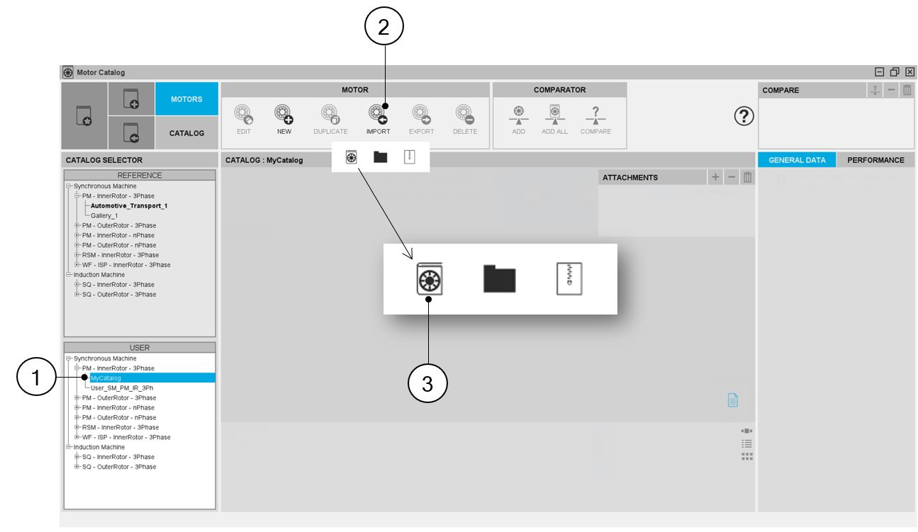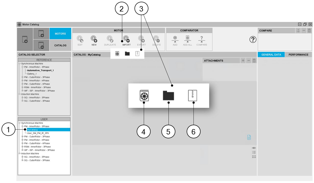 | 1 | Visualization of reference catalog i.e. the catalogs of motor topologies provided with FluxMotor®. Select them to view their contents and choose motors among them. |