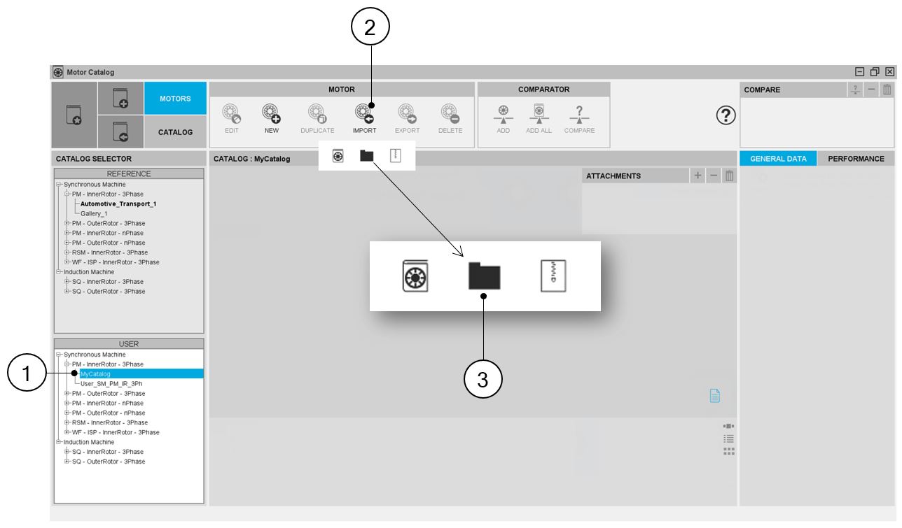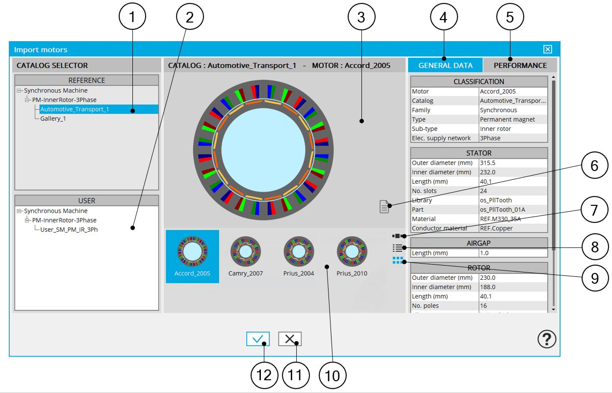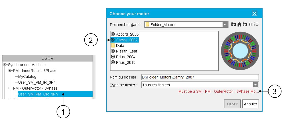 | 1 | Selected user’s catalog in which the motor must be imported: in that case outer rotor synchronous machine with permanent magnets |