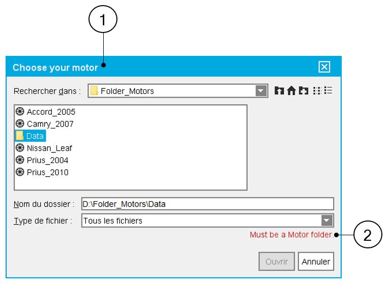 When the selected folder is not identified as a motor, a warning message is written in red (Must be a motor folder). The “Open” button will be disabled if the selected folder is not a motor. |