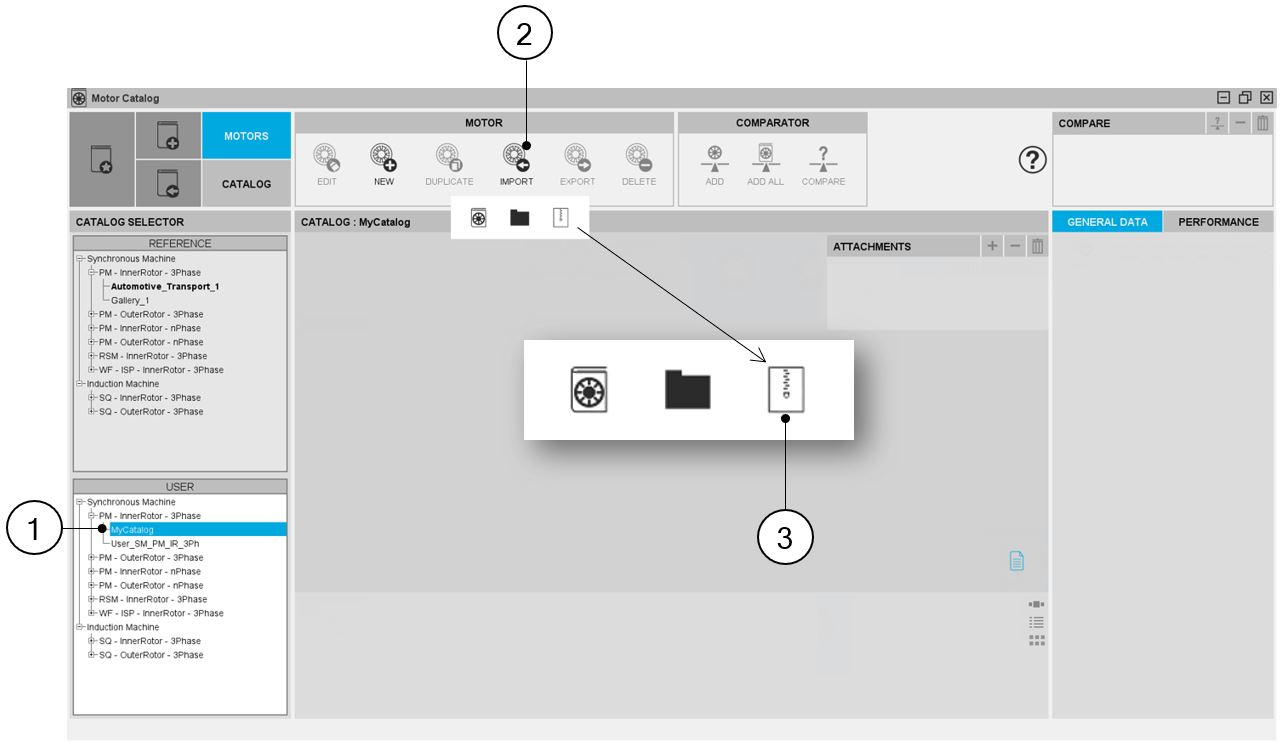 | 1 | Selection of a user’s catalog in which the motors to import will be