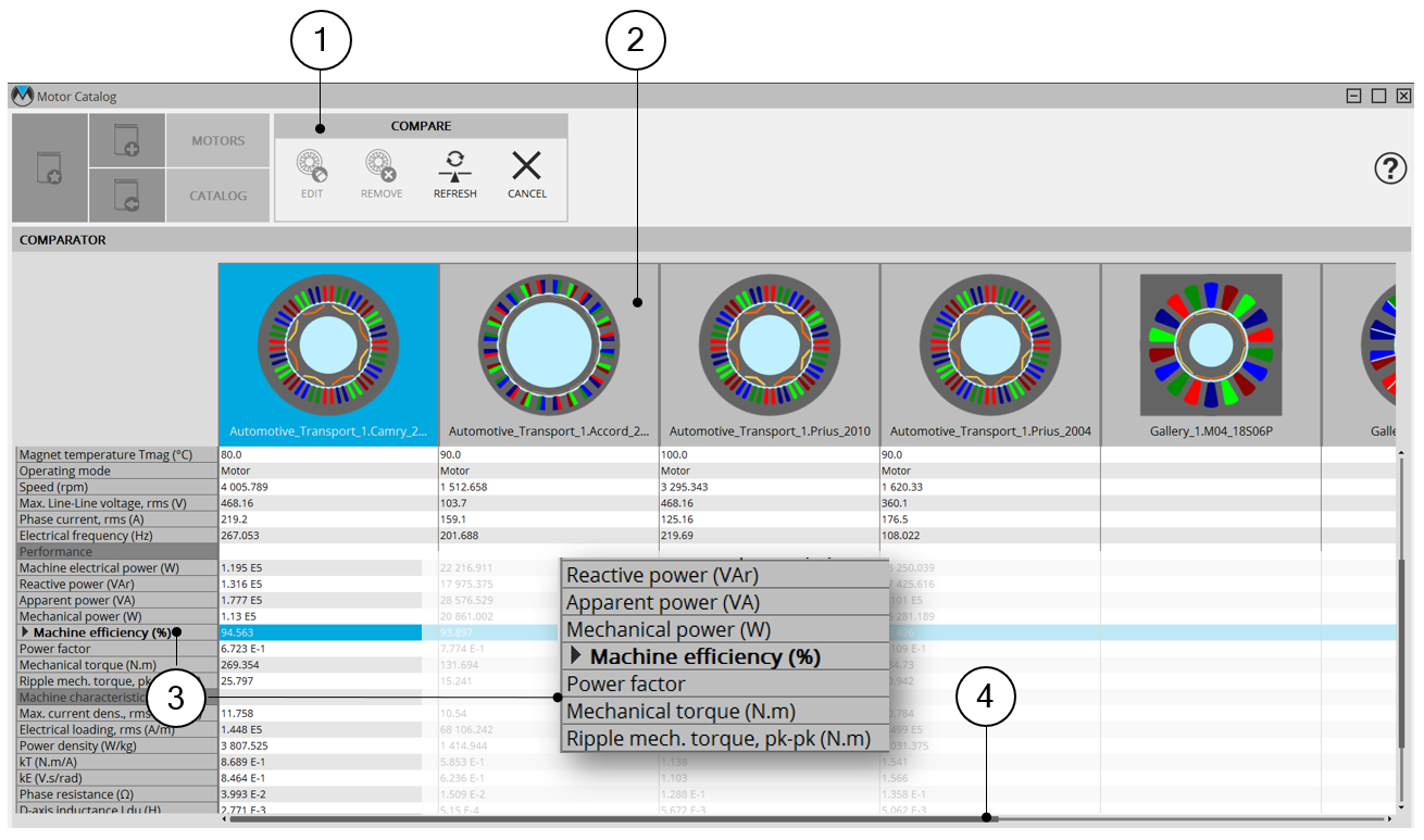 | 2 | All the selected motors are aligned to help the comparison.The general data and performance are displayed. |