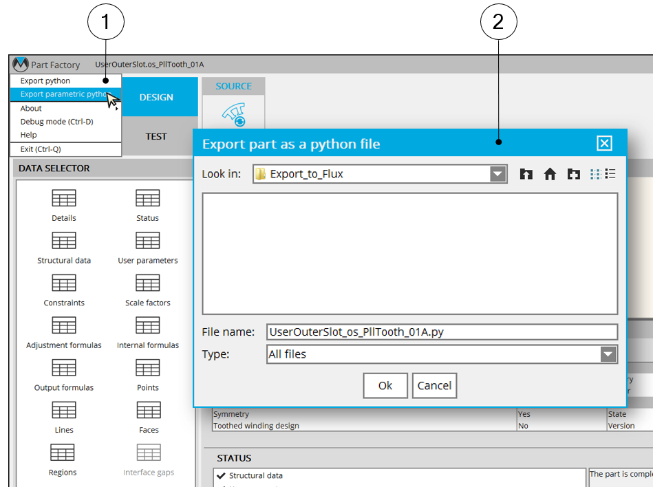 From Part Factory, it is possible to export a python file that allows the user to build the Flux® model of the considered part. To do that, Altair® FluxMotor® provides a python file that must be used in Flux® environment. To see the process, refer to the chapter dedicated to Flux® environment.