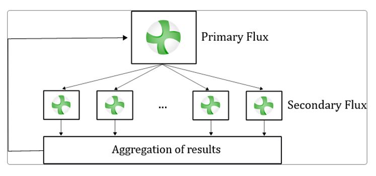 A primary Flux project is launched and controls all the other secondaries projects (distribution). The primary project oversees the gathering of all the results obtained during the solving process by all the sub-projects Flux as shown in the figure below: