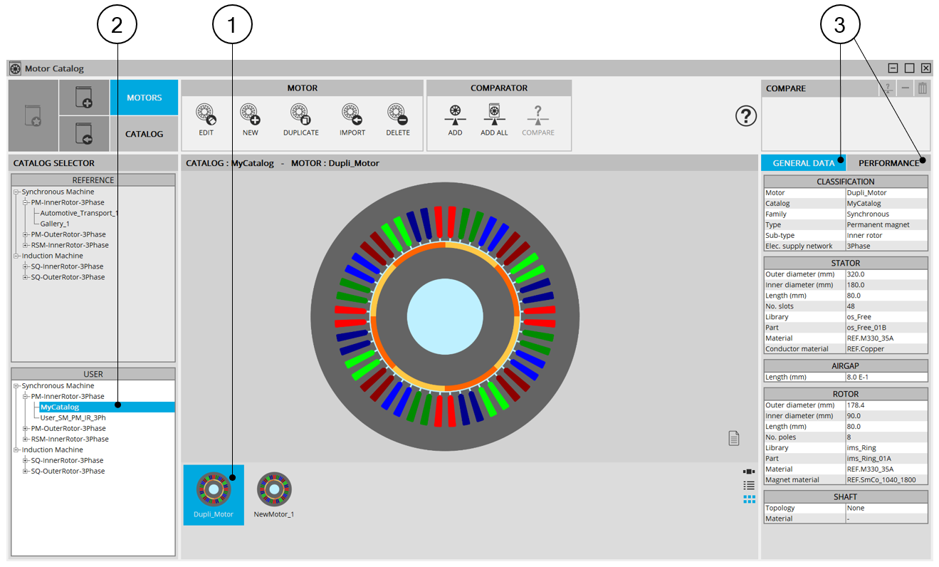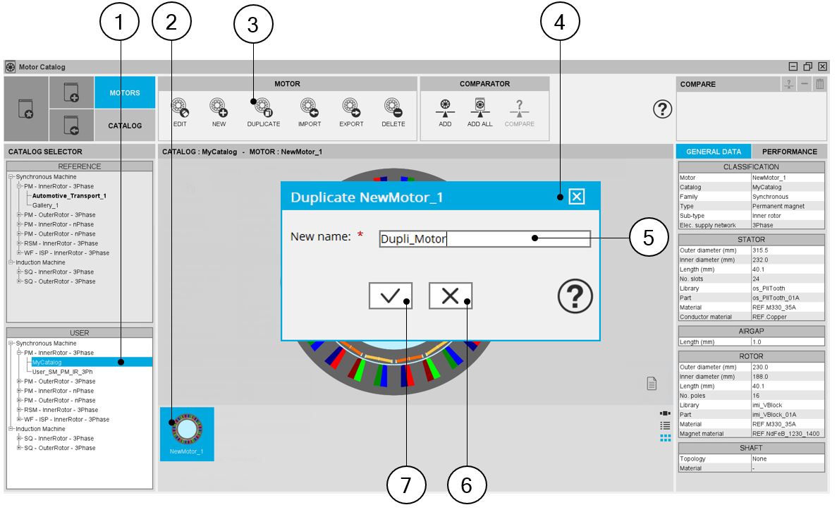 The duplication of a motor is possible only in a user’s catalog. If you select a Reference catalog, the icon "DUPLICATE" is disabled.