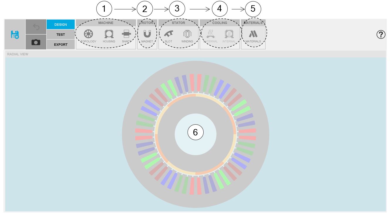 | Zone 5 MATERIALS | Area to select all the materials needed to build the machine, rotor, stator and the cooling |