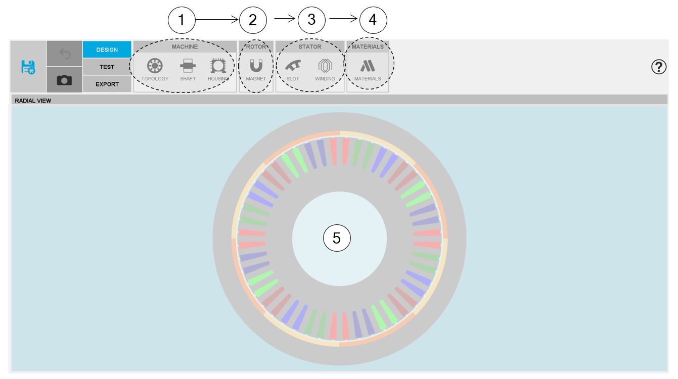 | Zone 4 MATERIALS | Area to select all the materials needed to build the machine, rotor and stator. |