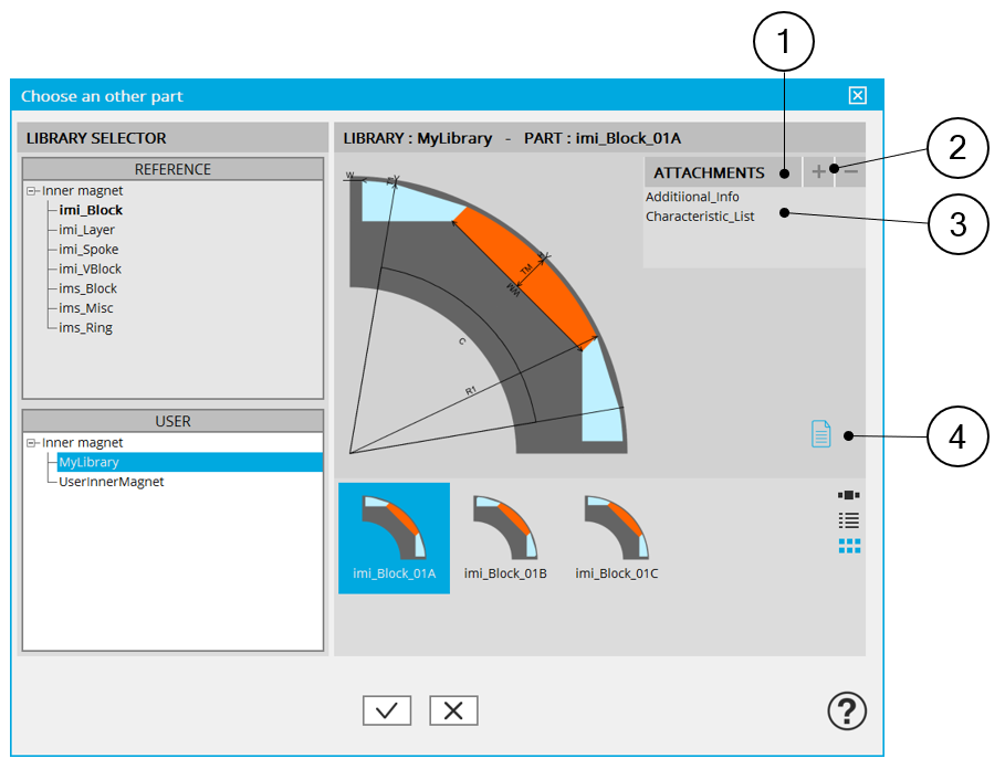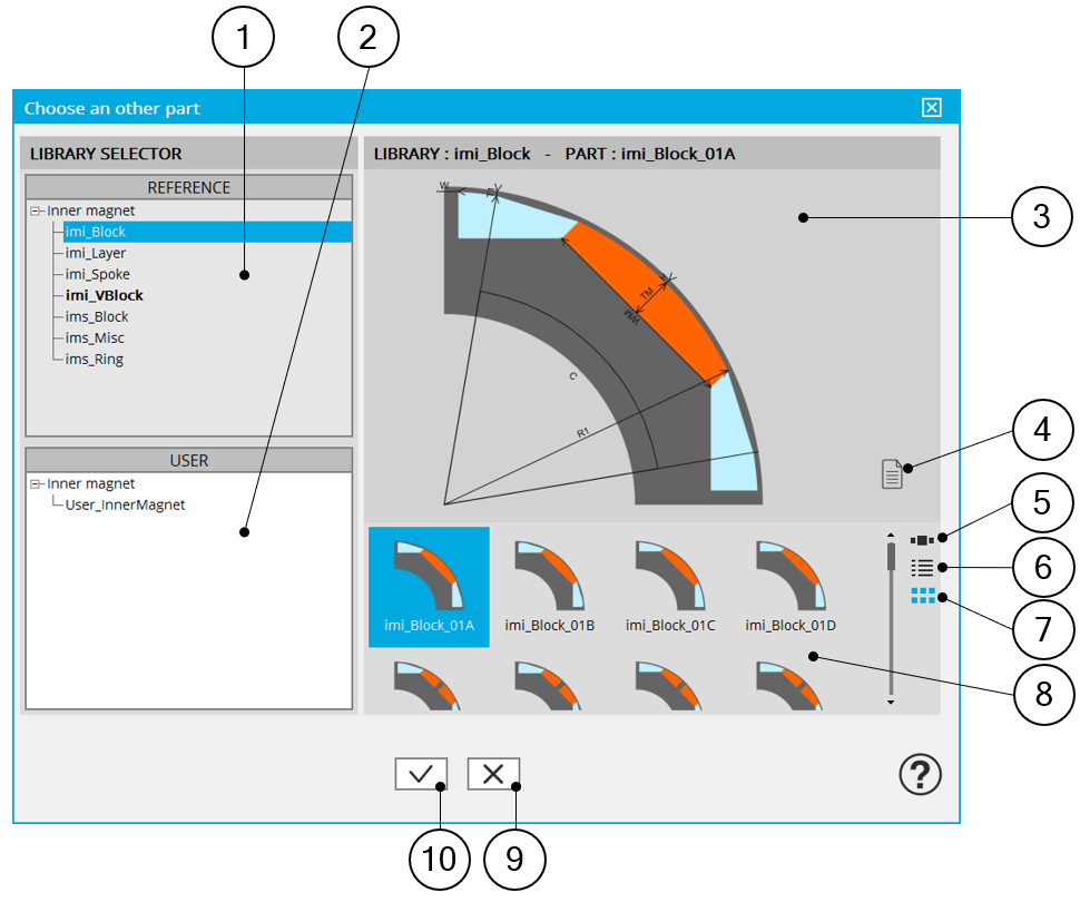 Visualization of reference libraries i.e. the libraries of magnet's topologies provided with Altair® FluxMotor®. Select them to view their content and choose the magnet among their content. See “Part Library” application for more information. |