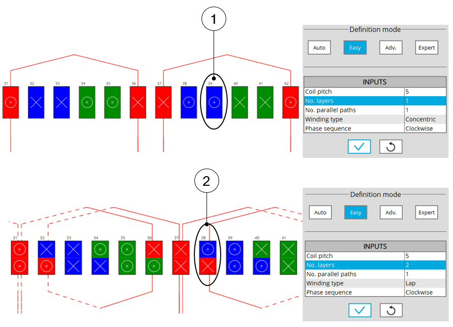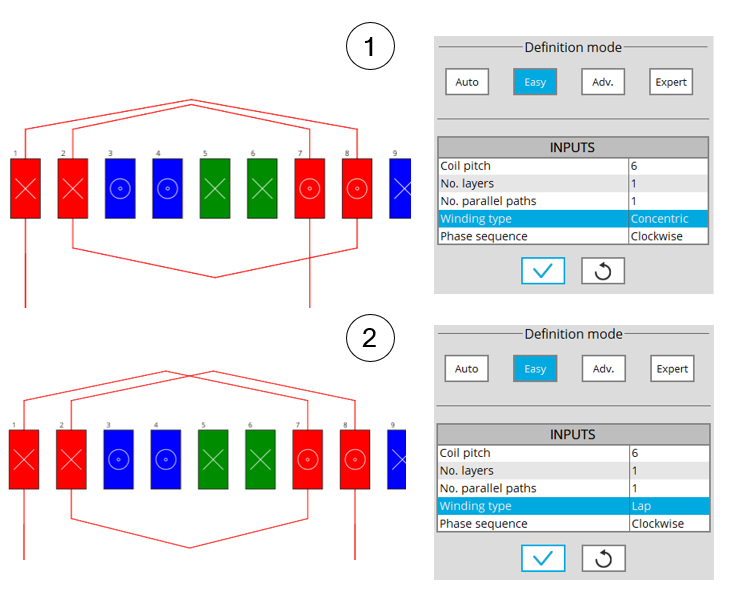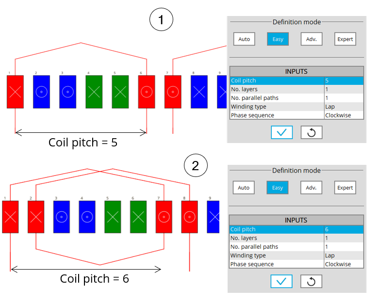 | Coil pitch | Coil pitch = number of slot pitch between coil input and coil output (Easy mode / Advanced mode). | |
