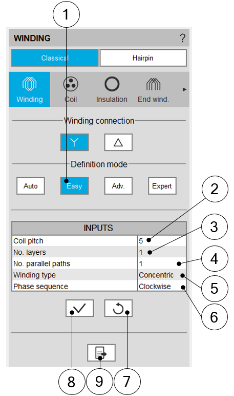 | 7 | Icon to restore default input values. Default values are those which defined the winding architecture by using the automatic mode. |