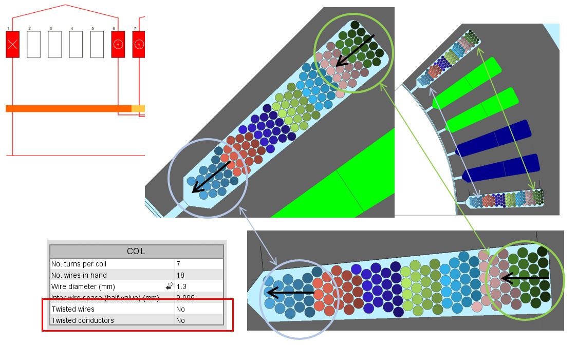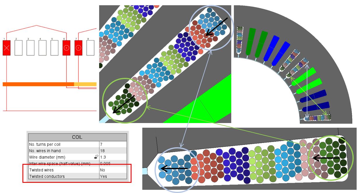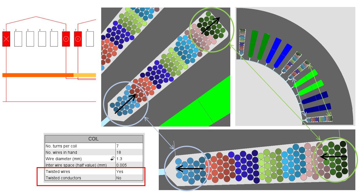 While defining the coil in the design / Winding area, it is possible to twist the wires inside the conductors between the forward and return sections of the coil. It is also possible to twist the conductors between the forward and return sections of the coil.