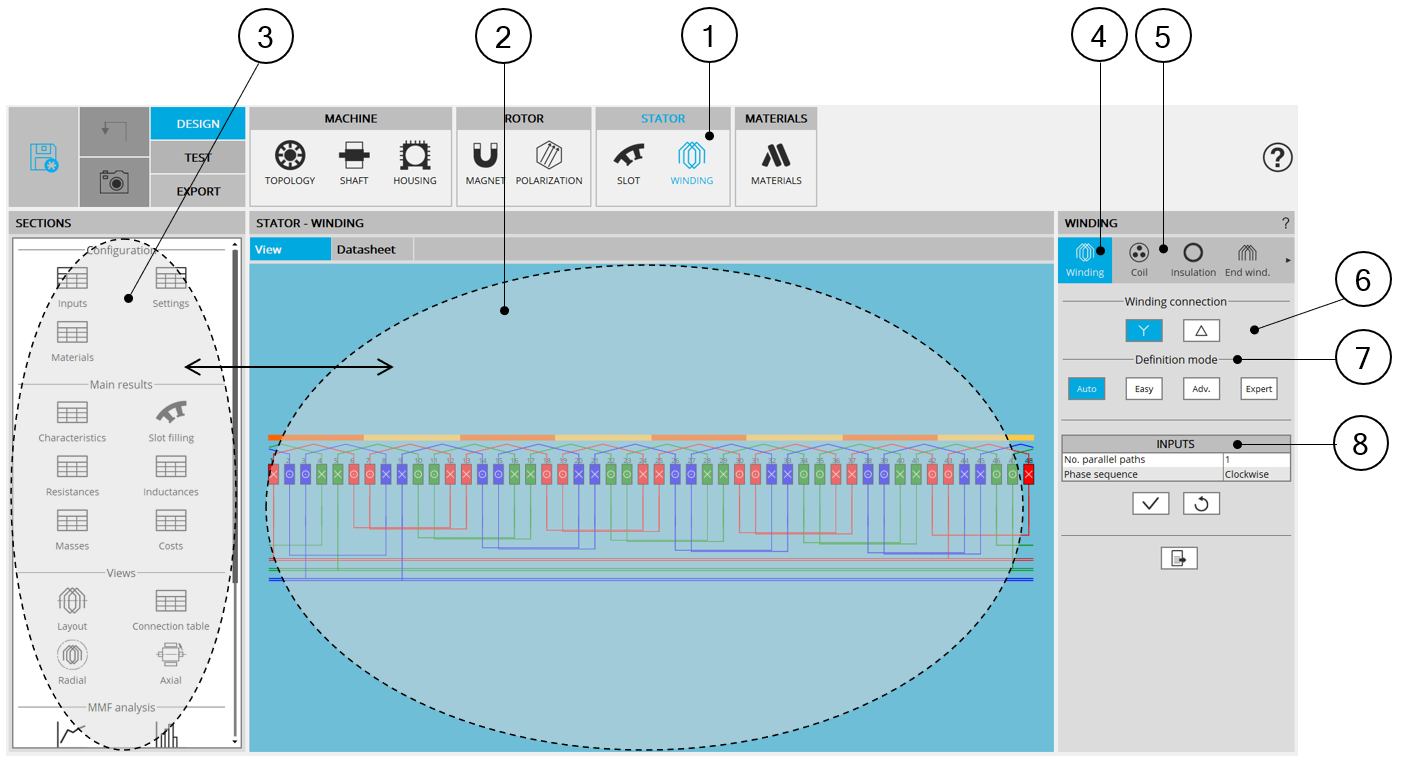| 1 | Selection bar where Winding, Coil, End-winding and X-Factor sections can be selected |