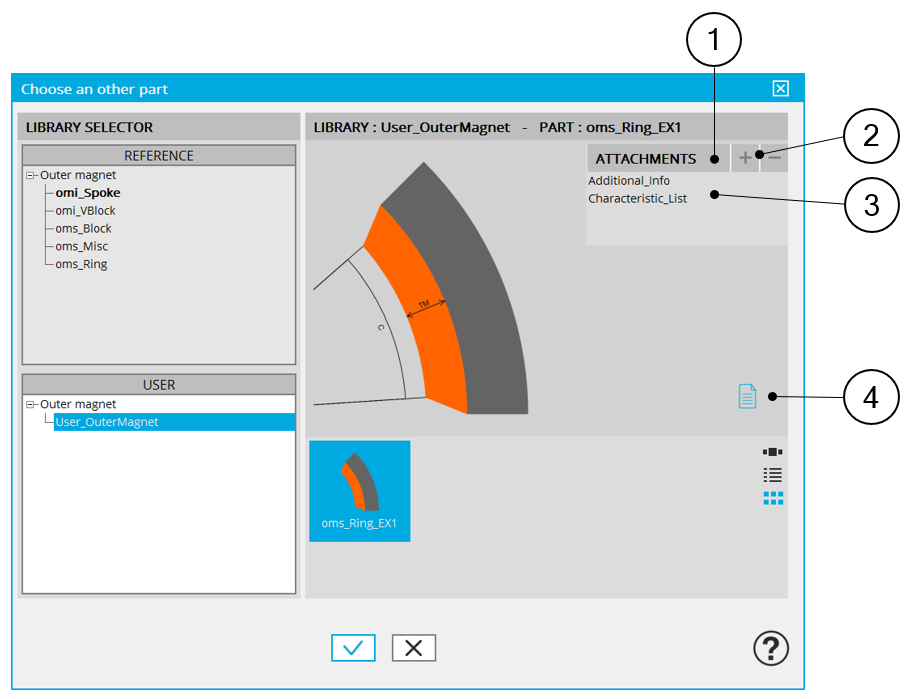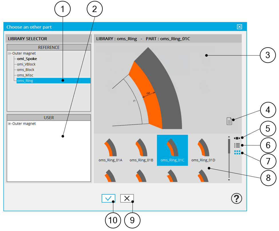 Visualization of reference libraries i.e. the libraries of magnet's topologies provided with the software. Select them to view their content and choose the magnet among their content. See “Part Library” application for more information. |