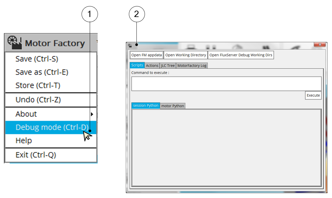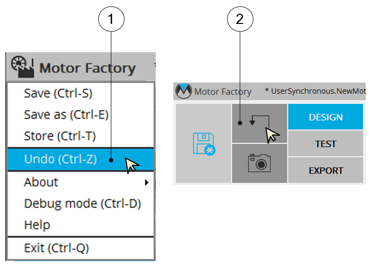 | 1 | Access to the “Debug mode” from the top menu of Motor Factory. |