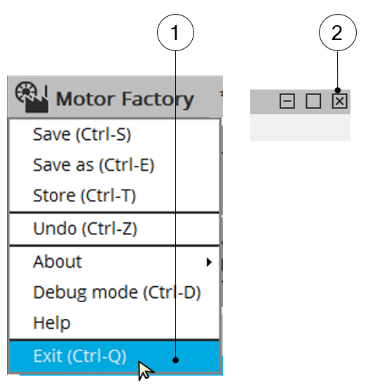 | 2 | Close Motor Factory by using the following icon on the right top part of the Motor Factory panel. |