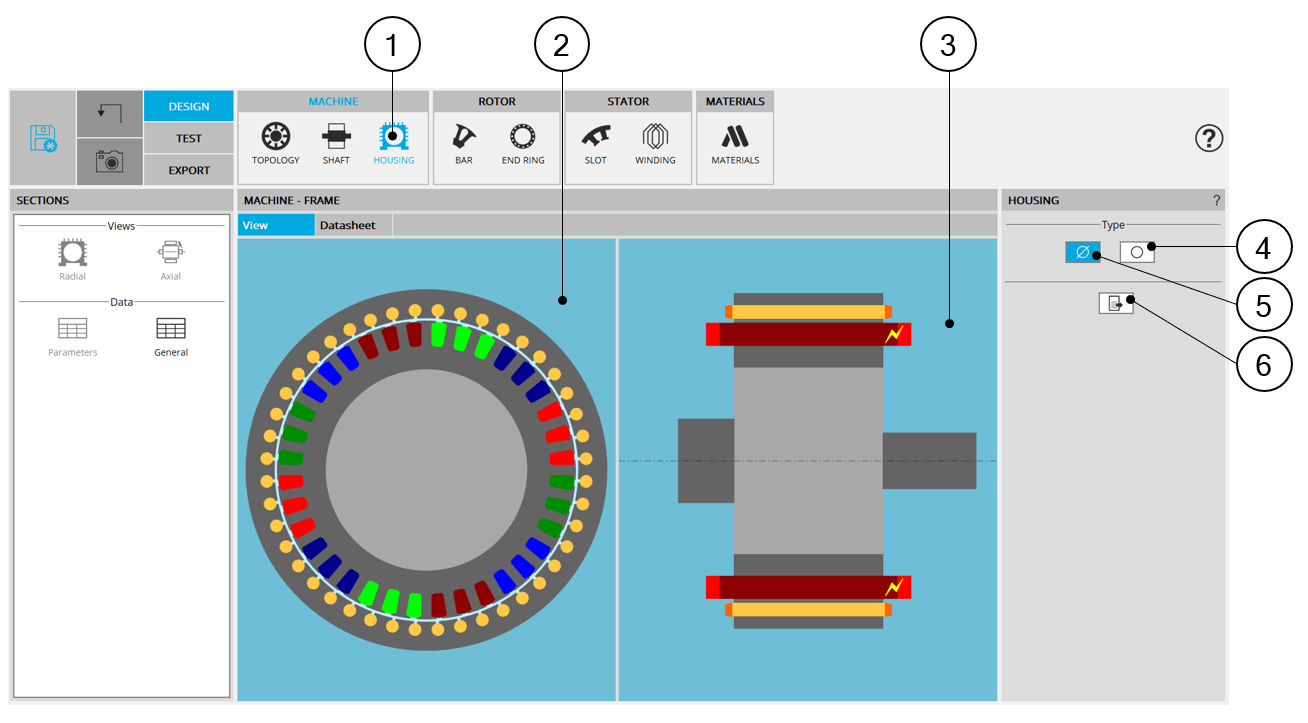 | 1 | Selection of the MACHINE subset: HOUSING panel (Click on the icon HOUSING) |