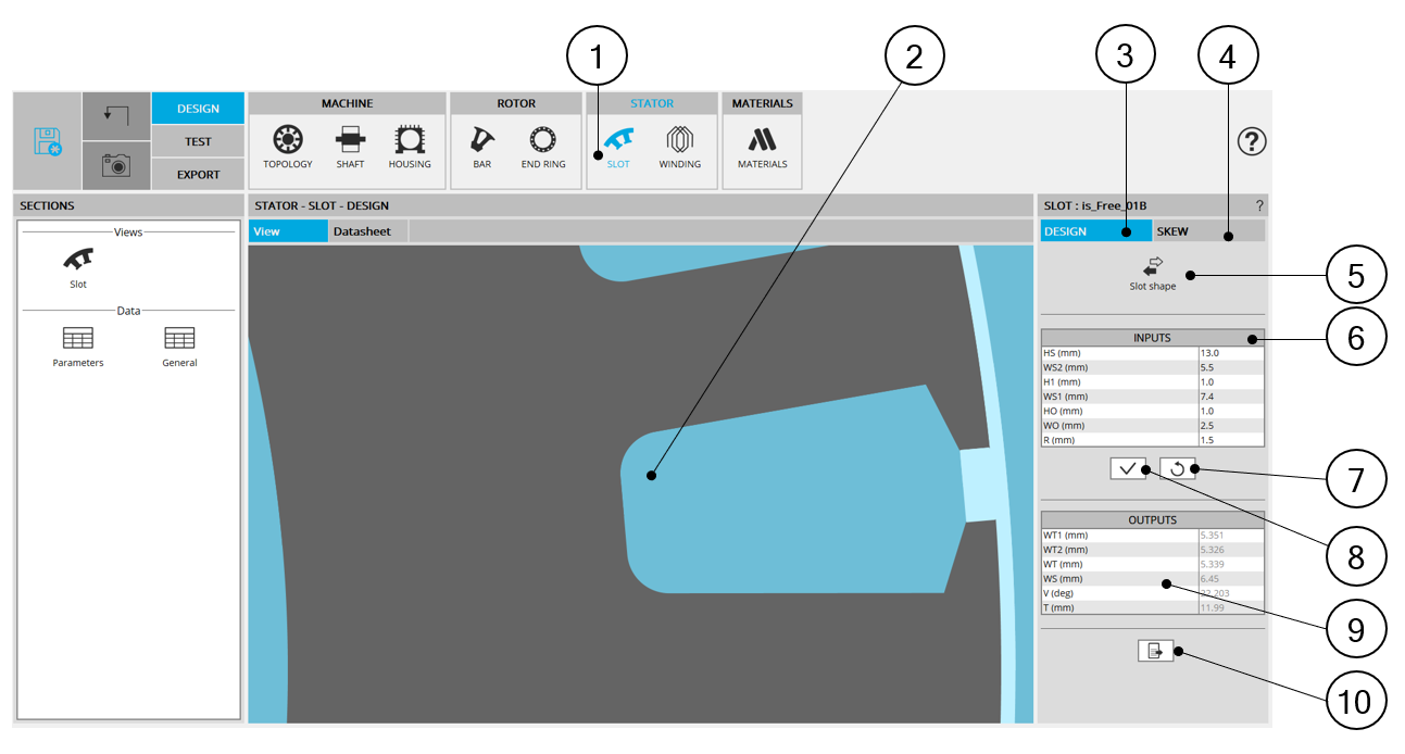 | 4 | SKEW tab indicates the tools to define the slot skew angle |
