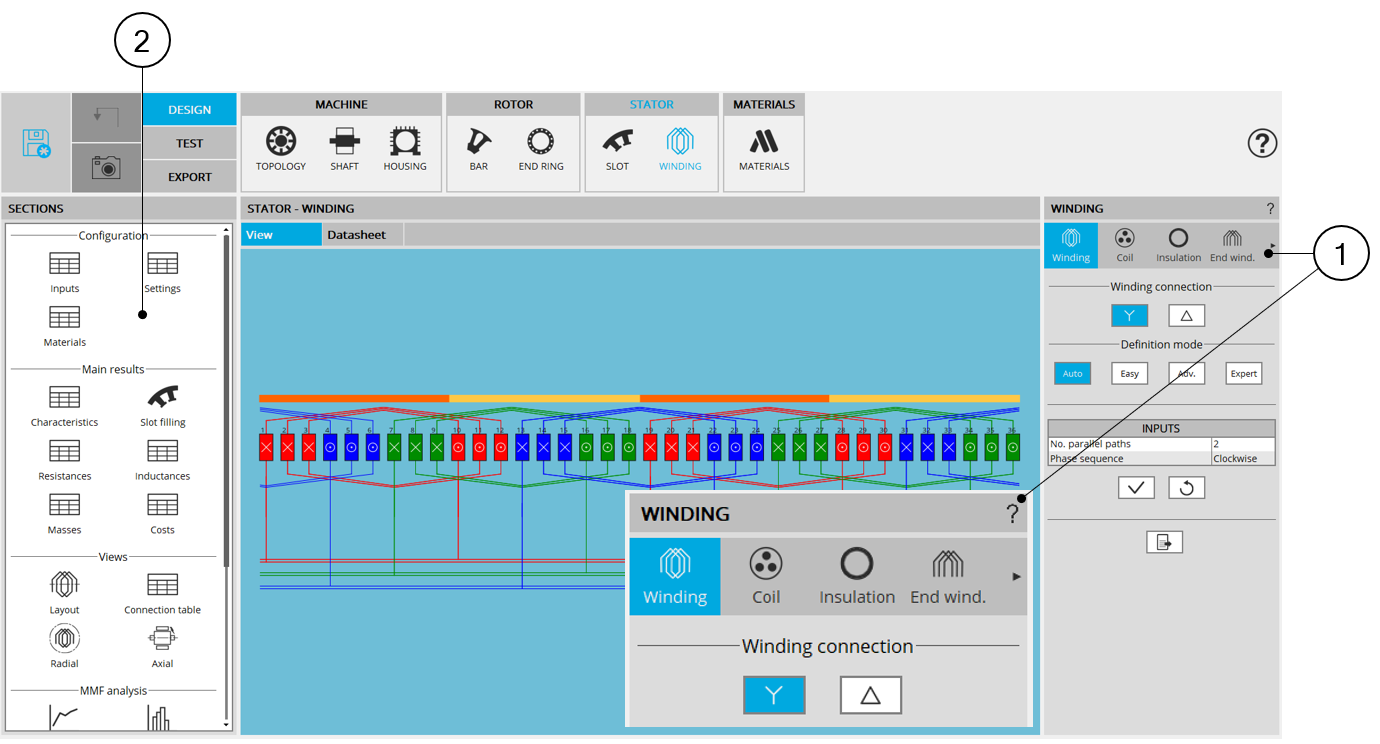 1 Selection bar where Winding, Coil, End-winding and X-Factor sections can be selected