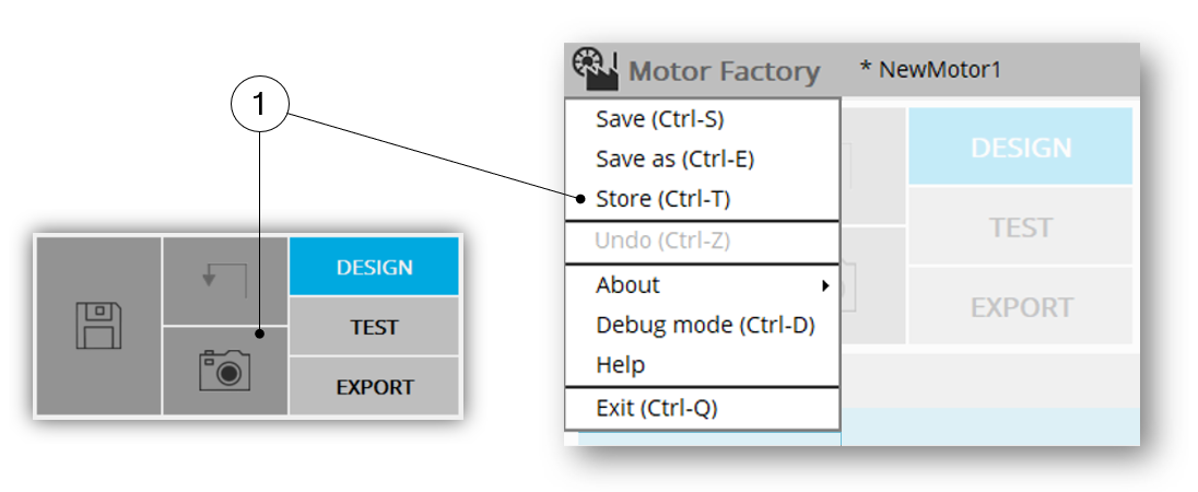 STORE” a project is possible directly from the top part of the Motor Factory (by using the camera) or via the top expanded menu.