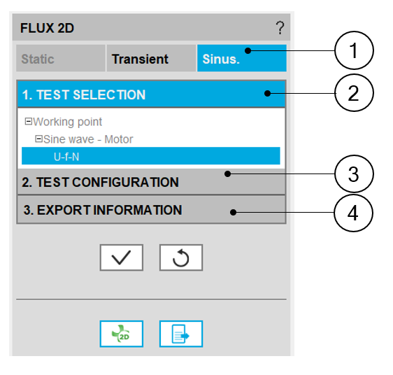 | 1 | Selection of application (SINUS or TRANSIENT) in which the model must be built for Flux® 2D |