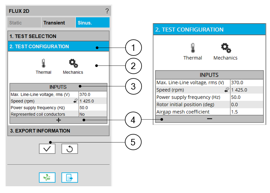 After having selected an application type (SINUS or TRANSIENT), the corresponding scenario (or test) inputs (settings and user inputs) must be defined. This allows to define the initial conditions for the simulation process in Flux® 2D environment.