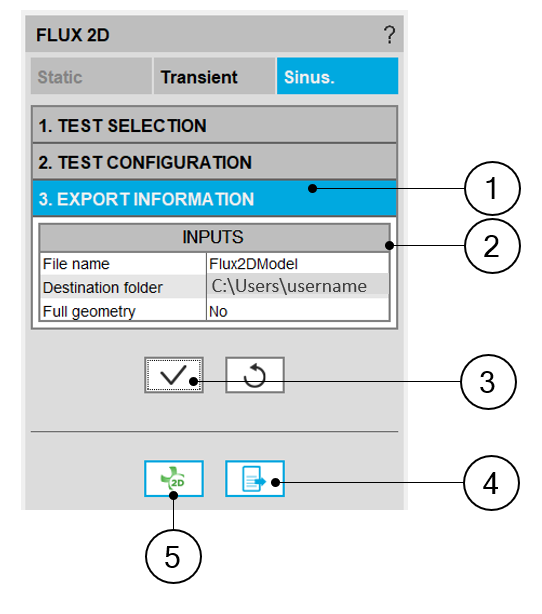 | 5 | Button to finalize the export of the model. This button launches Flux® 2D and builds the model. |