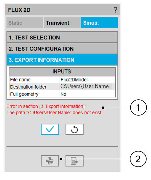 Motor Factory – EXPORT AREA – Export model for Flux® 2D – Error message 1 Error message display in red colored font. 2 The button to export the model is not active if some needed data is missing. -