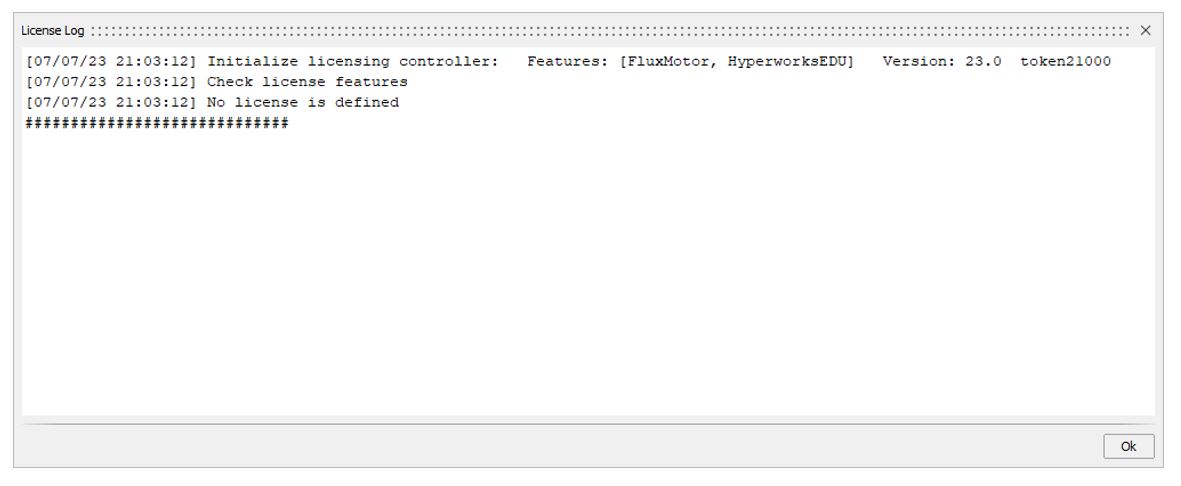- Firstly, the License Log window will open automatically and display an error message indicating that no license has been defined or that no FluxMotor feature is valid.