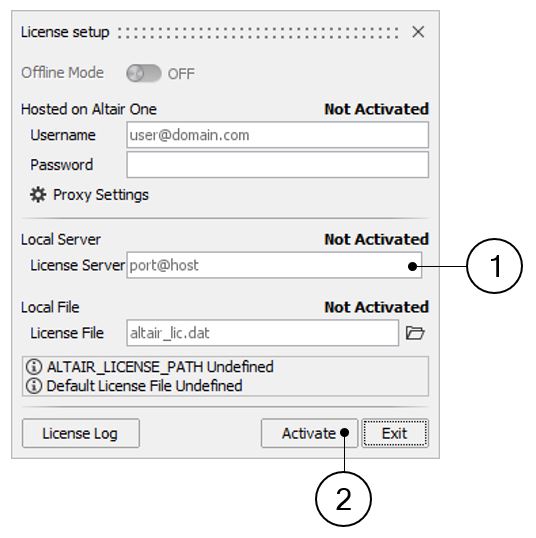 Figure 1 – License status Not Activated - Enter the port@host information for the License Server (Mark 1 - Figure 1 –