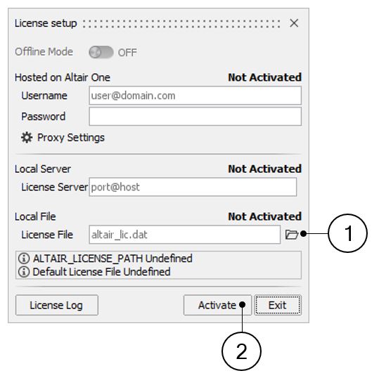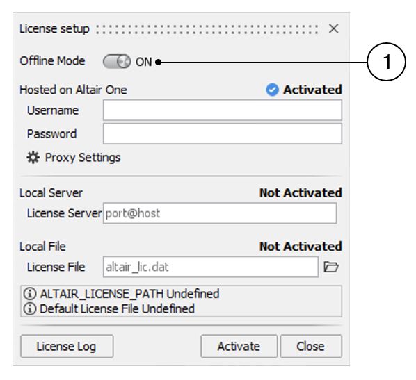 Click the “Offline Mode” slider (Mark 1 Figure 6 – License via Altair One – Offline Mode).